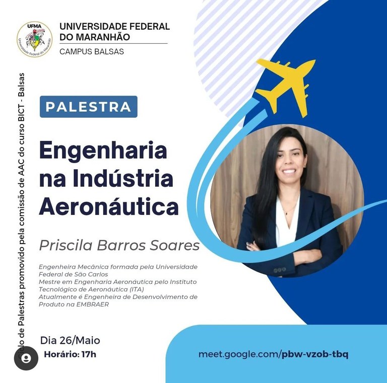 Nessa quinta-feira, 26, o Centro de Ciências de Balsas promoverá a palestra “Engenharia na indústria aeronáutica”, que será ministrada pela engenheira Priscila Barros Soares, a partir das 17h, pelo Google Meet. As inscrições podem ser realizadas por meio do Sigeventos.