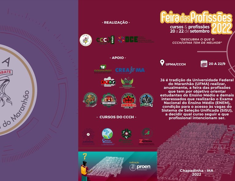 Após dois anos ocorrendo somente on-line, devido à pandemia de covid-19, será realizada, presencialmente, a Feira das Profissões, em que, no período de 20 a 22 de setembro, ocorrerá a edição do Centro de Ciências de Chapadinha (CCCh). O objetivo do evento é divulgar as habilidades, competências e perspectivas de mercado dos cursos do Câmpus de Chapadinha, o que inclui a infraestrutura do local.