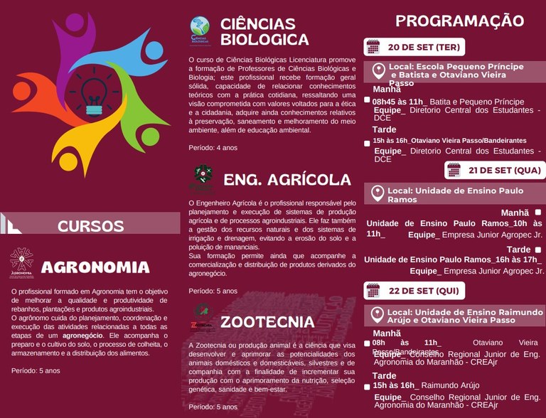 A Feira, em Chapadinha, foi concebida por meio da Pró-Reitoria de Ensino (Proen), direção do CCCh, Diretório Central dos Estudantes (DCE) e coordenações dos cursos. Para saber mais, confira abaixo a programação do evento.