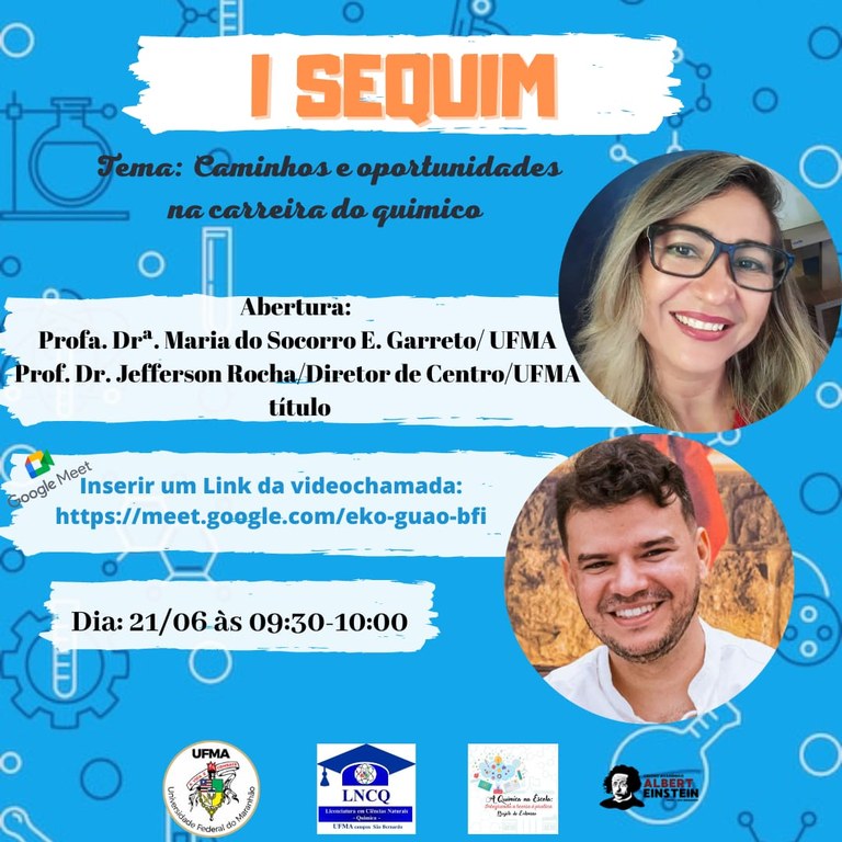 A palestra de abertura foi ministrada pelos professores da UFMA Maria do Socorro Evangelista Garreto e Jefferson Almeida Rocha, com o título “A Importância da Química e dos Químicos para a Sociedade”. A I Sequim é uma iniciativa promovida com a finalidade de comemorar o Dia do Químico, que foi celebrado em 18 de junho. “Acredita-se, portanto, que, mesmo durante um período difícil, conseguiremos entregar um evento científico enriquecedor para todos os participantes”, comentou Maria Evangelista.