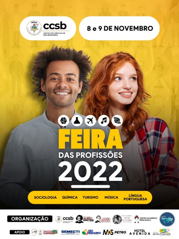 Aos estudantes que pretendem ingressar nos cursos de graduação do Centro de Ciências de São Bernardo (CCSB) da Universidade Federal do Maranhão recomenda-se que, neste ano, não percam a Feira das Profissões CCSB 2022. De forma totalmente presencial, o evento será realizado entre 8 e 9 deste mês, das 8h às 18h, contando com uma programação especial para jovens do ensino fundamental e médio de escolas públicas e particulares, residentes do Baixo Parnaíba Maranhense. As escolas interessadas em levar seus alunos à Feira das Profissões podem se cadastrar até essa segunda-feira, 7, de forma gratuita e on-line, via formulário de inscrição.