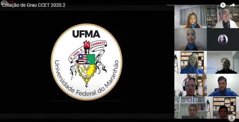 De forma remota, ocorreu, na noite de quarta-feira, 16, a cerimônia de colação de grau dos cursos de graduação do Centro de Ciências Exatas e Tecnologias (CCET) da Universidade Federal do Maranhão, referente ao semestre 2020.2, com transmissão pelo Canal Institucional da UFMA, no Youtube. Ao todo, foram 52 alunos que receberam a outorga do grau, relativo aos cursos de Química Industrial, Ciência da Computação, Design, Engenharia Ambiental e Sanitária, Engenharia da Computação, Engenharia Elétrica, Engenharia Mecânica, Engenharia Química, Física e Química.