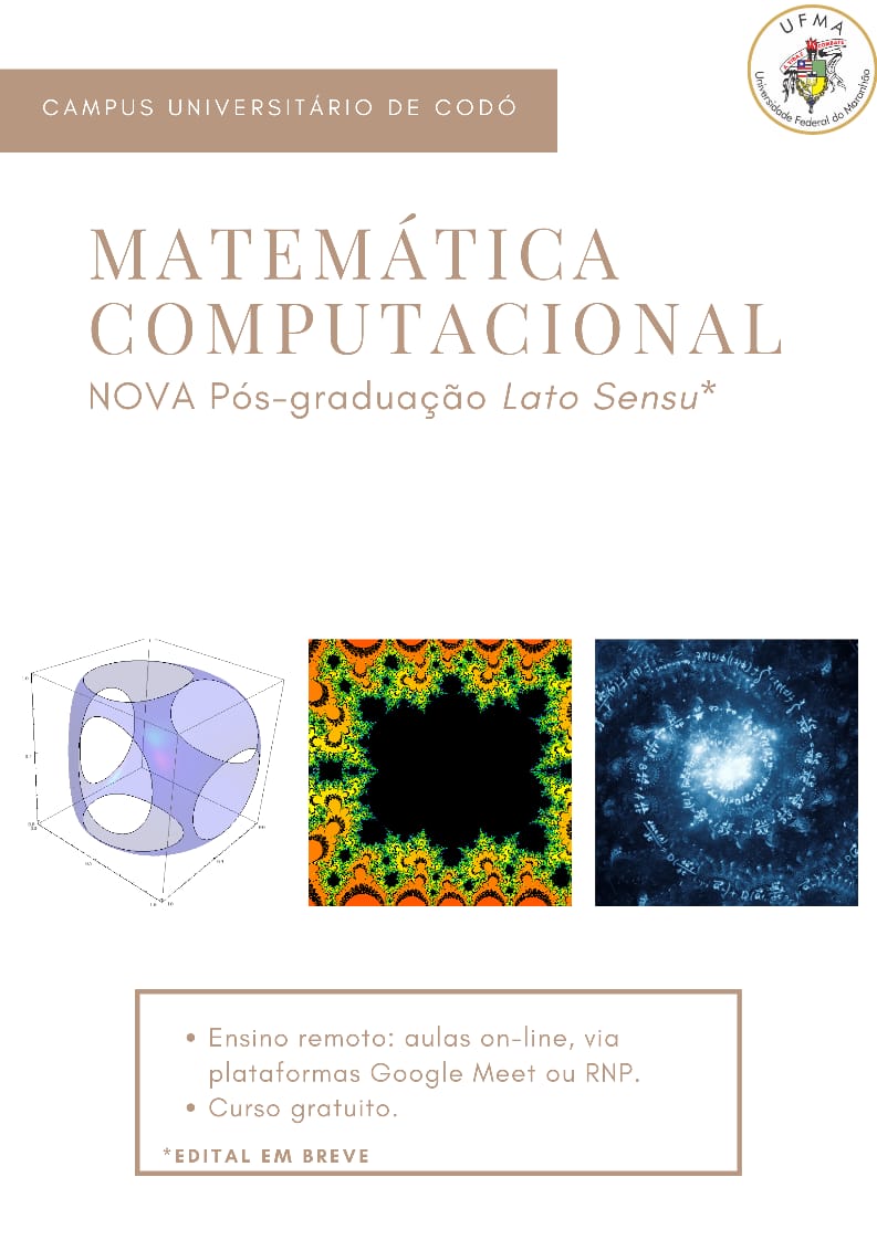 CODÓ – No mês de janeiro de 2021, o Câmpus de Codó lançará edital do novo curso de especialização em Matemática Computacional, que será ministrado no formato de ensino remoto, com aulas às sextas-feiras (à noite) e aos sábados (diurno), via plataforma do Google Meet. Ao longo do curso, os participantes desenvolverão habilidades de programação em duas linguagens (Python e R) e terão aulas de probabilidade, inferência estatística, computação científica, modelagem e epidemiologia matemática, sistemas dinâmicos, aprendizado de máquinas, análise de Dados, entre outros assuntos.