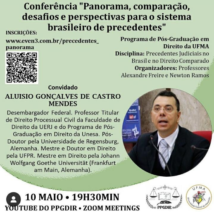 No dia 10 de maio, a partir das 19h30, via Zoom Meetings, será realizada a conferência "Panorama, comparação, desafios e perspectivas para o sistema brasileiro de precedentes", evento organizado pelos professores do curso de Direito Alexandre Reis Freire e Newton Ramos Neto, ambos da Universidade Federal do Maranhão. O encontro faz parte da disciplina "Precedentes judiciais no Brasil e no direito comparado", do Programa de Pós-Graduação em Direito e Instituições do Sistema de Justiça (PPGDIR).
