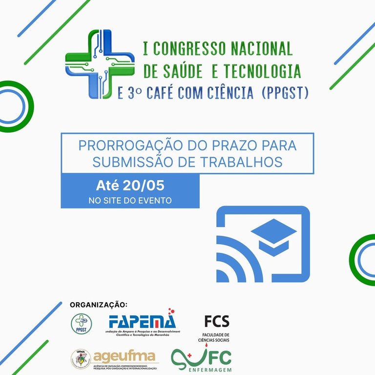 O Programa de Pós-Graduação em Saúde e Tecnologia do Câmpus Imperatriz, em parceria com a Agência de Inovação, Empreendedorismo, Pesquisa, Pós-Graduação e Internacionalização (Ageufma) e a Fundação de Amparo à Pesquisa no Maranhão (Fapema), realizará, entre os dias 8 e 10 de junho, o Congresso Nacional de Saúde e Tecnologia e a 3ª edição do Café com Ciência. As submissões de resumos simples foram prorrogadas e podem ser feitas até esta sexta-feira, 20, e as atividades serão realizadas de forma híbrida.