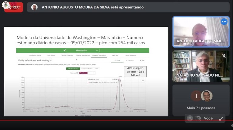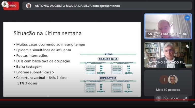 O reitor agradeceu a apresentação científica e ilustrativa sobre os dados e mencionou sobre o contexto atual. “Nós vivemos num momento de incertezas, e cada dia é um dia. Estamos numa fase crítica, aguda da doença, em que a quantidade de servidores com síndromes respiratórias agudas é intensa. O Hospital Universitário está com dificuldade em alguns setores pela quantidade de funcionários afastados, e alguns setores da UFMA suspenderam a atividade em decorrência de casos, e já há o cenário de universidades suspendendo atividades presenciais. A Universidade Federal do Maranhão não vai se omitir de tomar as decisões necessárias”, declarou.
