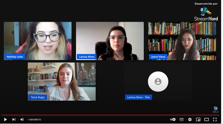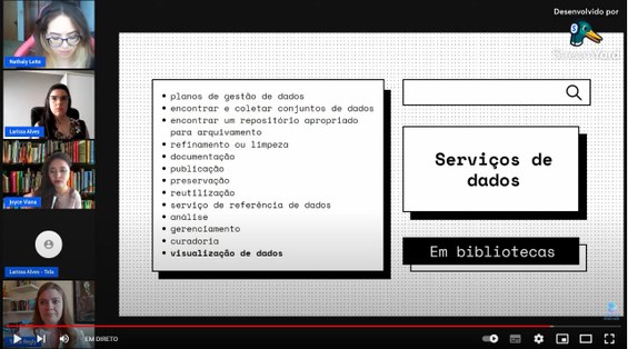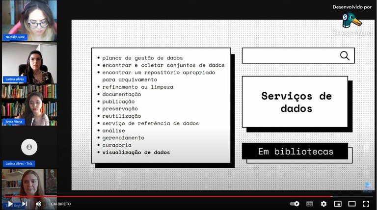 O evento teve como palestrantes a bibliotecária da CRB-1 Larissa de Araújo Alves, as pesquisadoras do Ibict Joyce Mirella dos Anjos Viana e Nathaly Cristine Leite Rocha, e a assistente de pesquisa Tainá Regly, do mesmo Instituto.