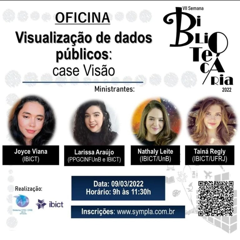 Ocorreu, na manhã desta quarta-feira, 9, durante a Semana Bibliotecária, evento promovido pelo Conselho Regional de Biblioteconomia (CRB-13), a oficina “Visualização de dados públicos: case visão”, ofertada pelo Instituto Brasileiro de Informação em Ciência e Tecnologia (Ibict) na programação. A ação foi transmitida pelo canal do CBR 13 Maranhão no Youtube.