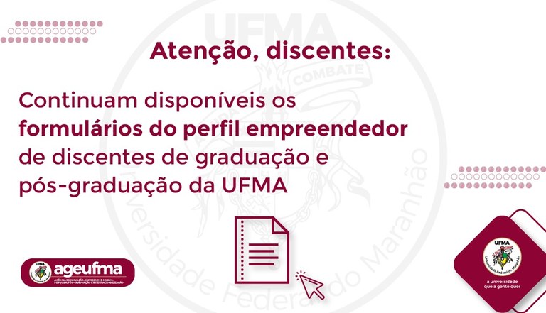 A Universidade Federal do Maranhão, por meio da Agência de Inovação, Empreendedorismo, Pesquisa, Pós-Graduação e Internacionalização (Ageufma), informa que continuam disponíveis os formulários da pesquisa sobre o perfil empreendedor dos discentes de graduação e pós-graduação da Universidade Federal do Maranhão.
