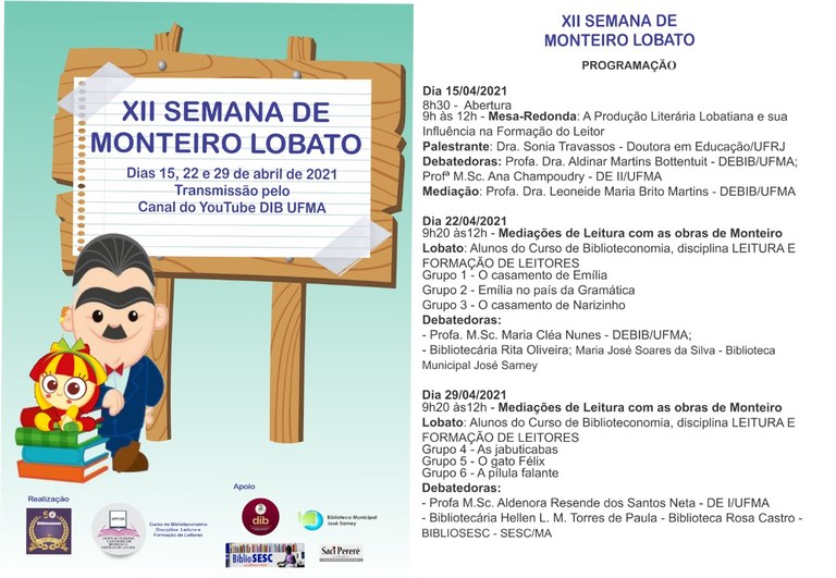 O departamento de Biblioteconomia realizará, nos dias 15, 22 e 29 de abril, a XII Semana de Monteiro Lobato, com o objetivo de debater a importância da literatura lobatiana na formação de leitores, de forma contextualizada e crítica, visando ampliar o debate em torno das temáticas abordadas, pontos de vista, personagens, ambiente, período histórico e outras características literárias.