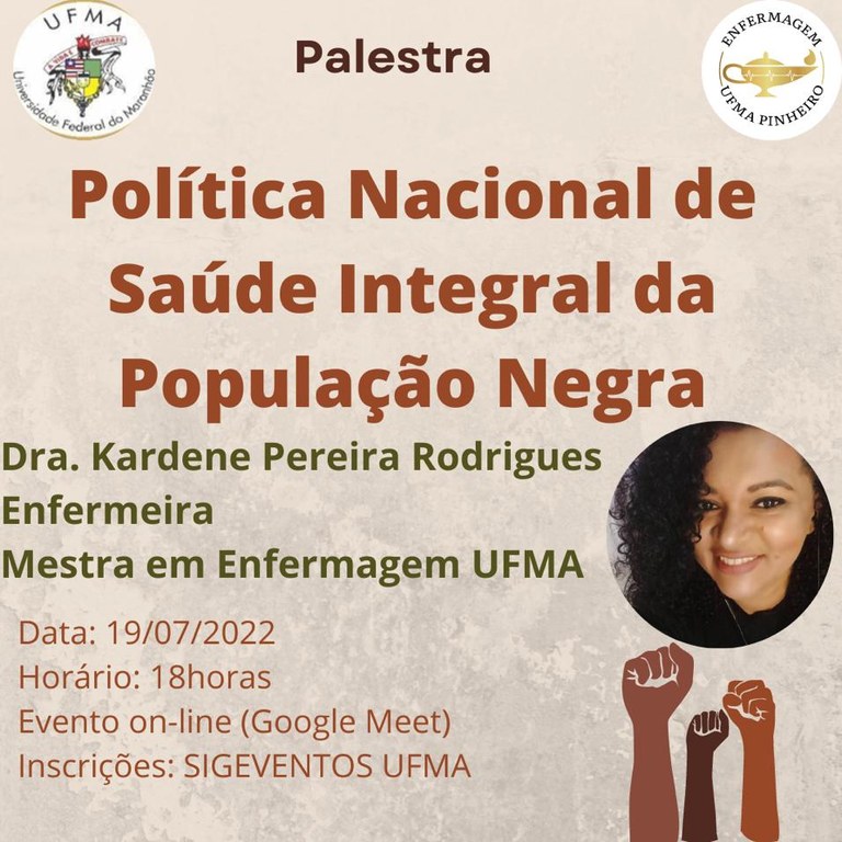 Com o objetivo de contribuir com ações afirmativas para a promoção do cuidado à população negra no âmbito da saúde, o curso de Enfermagem do Centro de Ciências de Pinheiro realizará, no dia 19 de julho, via Google Meet, a palestra de tema “Política Nacional de Saúde Integral da População Negra”, a ser ministrada pela enfermeira Kardene Pereira Rodrigues, mestra em Enfermagem pela UFMA.