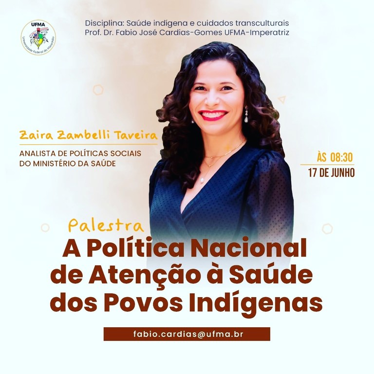O curso de Enfermagem do Centro de Ciências de Imperatriz, com a organização do professor, psicólogo e indianista Fábio Cardias-Gomes, promoverá palestra sobre a Política Nacional de Atenção à Saúde dos Povos Indígenas (Pnaspi), a ser ministrada por Zaira Zambelli Taveira, analista de Políticas Sociais do Ministério da Saúde. O evento será nessa sexta-feira, 17, via Google Meet, com início às 8h30, com discussão das ações de saúde aos povos indígenas no âmbito do Sistema Único de Saúde (SUS),