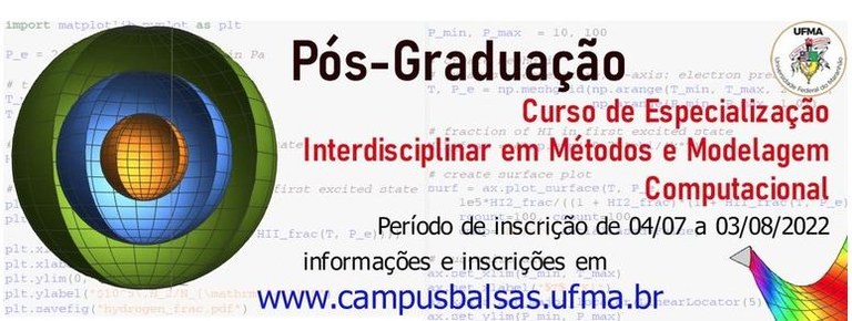O Curso de Especialização Interdisciplinar em Métodos e Modelagem Computacional (IMMC) do Centro de Ciências de Balsas abrirá inscrições, entre os dias 4 de julho a 3 de agosto, para nova turma. A qualificação será oferecida na modalidade a distância, disponibilizando um total de 50 vagas. Ele é voltado para as pessoas com diploma de curso superior reconhecido pelo MEC em Bacharelado Interdisciplinar em Ciência e Tecnologia, Engenharia, Física, Química, Biologia, Matemática, entre outros cursos de áreas correlatas.