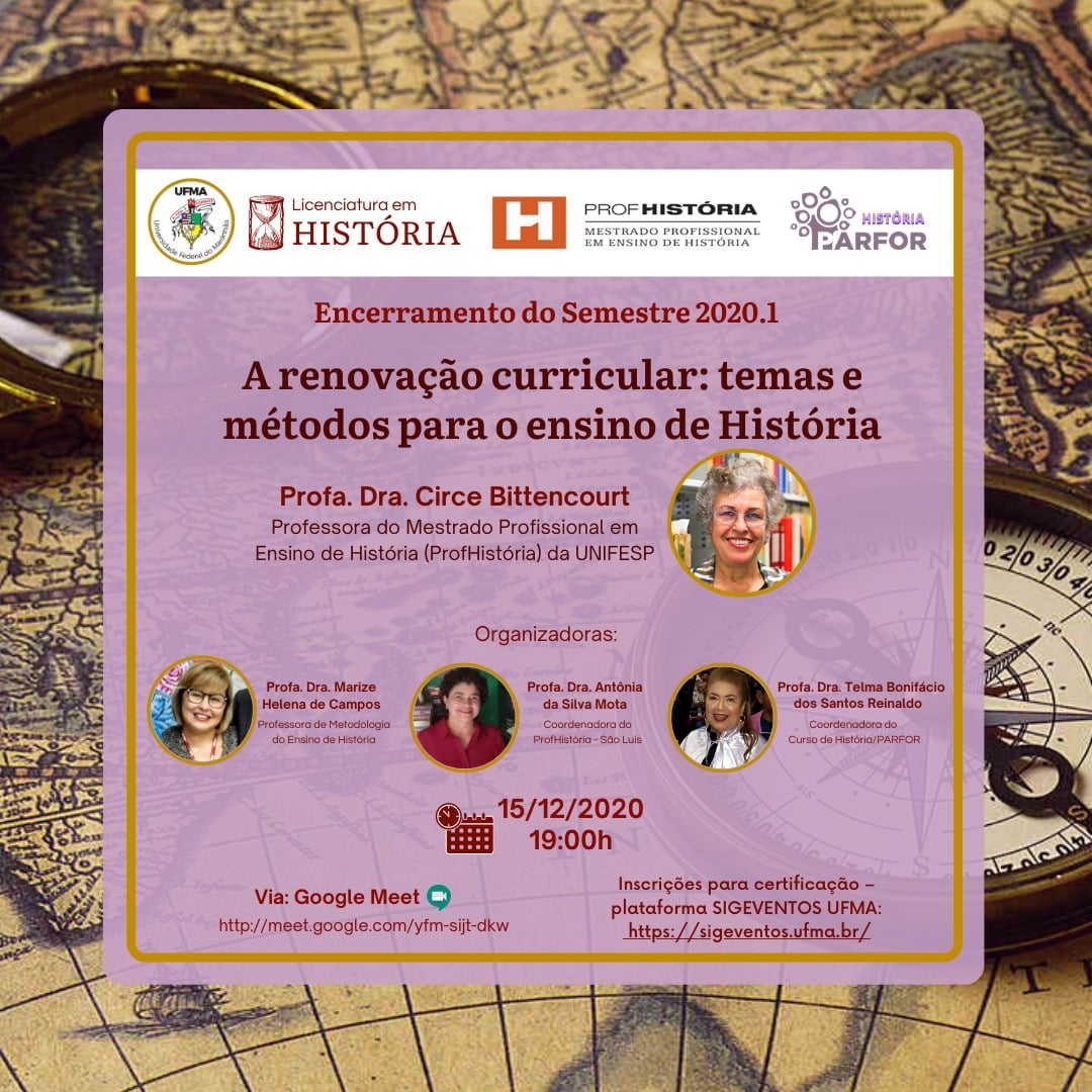 A temática que será abordada é “A renovação curricular: temas e métodos para o ensino de História”, que será debatida pela professora do mestrado ProfHistória da Universidade Federal de São Paulo (Unifesp), Circe Bittencourt. Para certificação, os interessados devem se inscrever até o dia 14 de dezembro por meio da plataforma SIGEventos da UFMA.