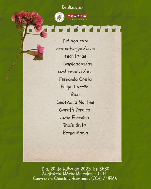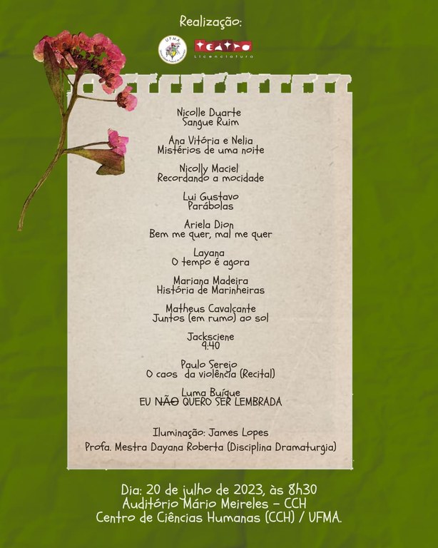 O Curso de Licenciatura em Teatro da Universidade Federal do Maranhão realizará, amanhã, 20, com início às 8h30, no Auditório Mário Meireles, localizado no Centro de Ciências Humanas Câmpus São Luís, o Sarau Dramatúrgico. O propósito do evento é apresentar à comunidade acadêmica o resultado da disciplina de Dramaturgia 2023.1, compartilhando o processo criativo dos estudantes de Teatro como um exercício público de conclusão dessa matéria.