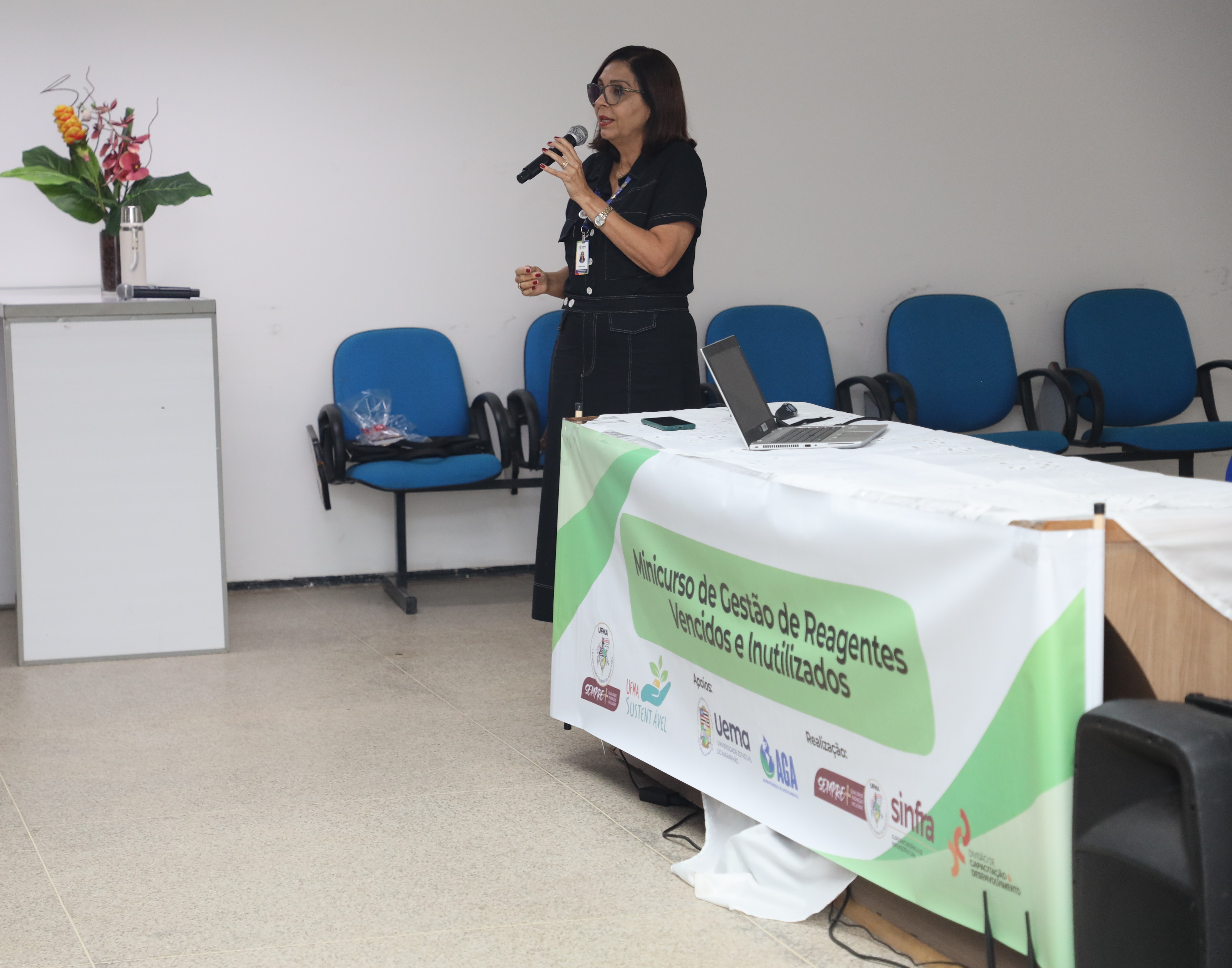 Com o objetivo de orientar a comunidade acadêmica sobre identificação, isolamento, etiquetagem, registro e descarte seguro de reagentes vencidos ou inutilizados, além de fomentar práticas de reaproveitamento fundamentadas em princípios de química verde e sustentabilidade, a capacitação foi ministrada pela coordenadora do Eixo Resíduos Perigosos da Superintendência de Gestão Ambiental da UEMA, Socorro Nahuz.