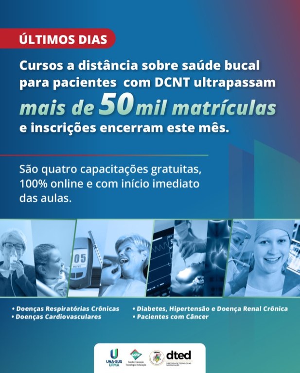 A Universidade Aberta do Sistema Único de Saúde da Universidade Federal do Maranhão (UNA-SUS-UFMA) oferta o programa “Assistência Odontológica para Pacientes com DCNT na Atenção Primária”, que já ultrapassou mais de 50 mil matrículas no ambiente virtual de aprendizagem. O programa foi lançado em 2020 e conta com quatro cursos com matrículas abertas até 9 de fevereiro.