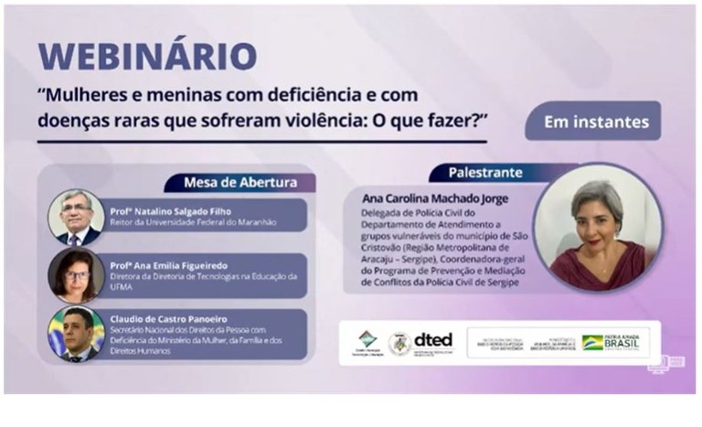 O evento foi realizado em alusão ao lançamento do curso “Acessibilidade nas delegacias brasileiras e atendimento às mulheres e meninas com deficiências e doenças raras”, fruto da parceria entre o Ministério da Mulher, da Família e Direitos Humanos e da Universidade Federal do Maranhão, por meio da Diretoria de Tecnologias na Educação (DTED-UFMA).