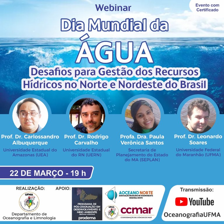 A Universidade Federal do Maranhão, por meio do Departamento de Oceanografia e Limnologia, realizará um webinário no dia 22 de março em comemoração ao Dia Mundial da Água, com a temática: "Desafios para a Gestão dos Recursos Hídricos no Norte e Nordeste do Brasil". A mediação do bate-papo será por conta do professor do Departamento de Oceanografia e Limnologia e pró-reitor de Assistência Estudantil (Proaes) da UFMA, Leonardo Soares.