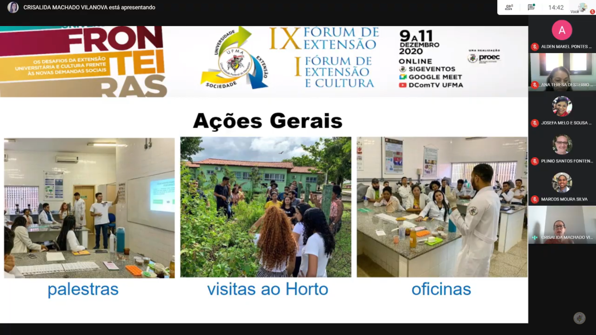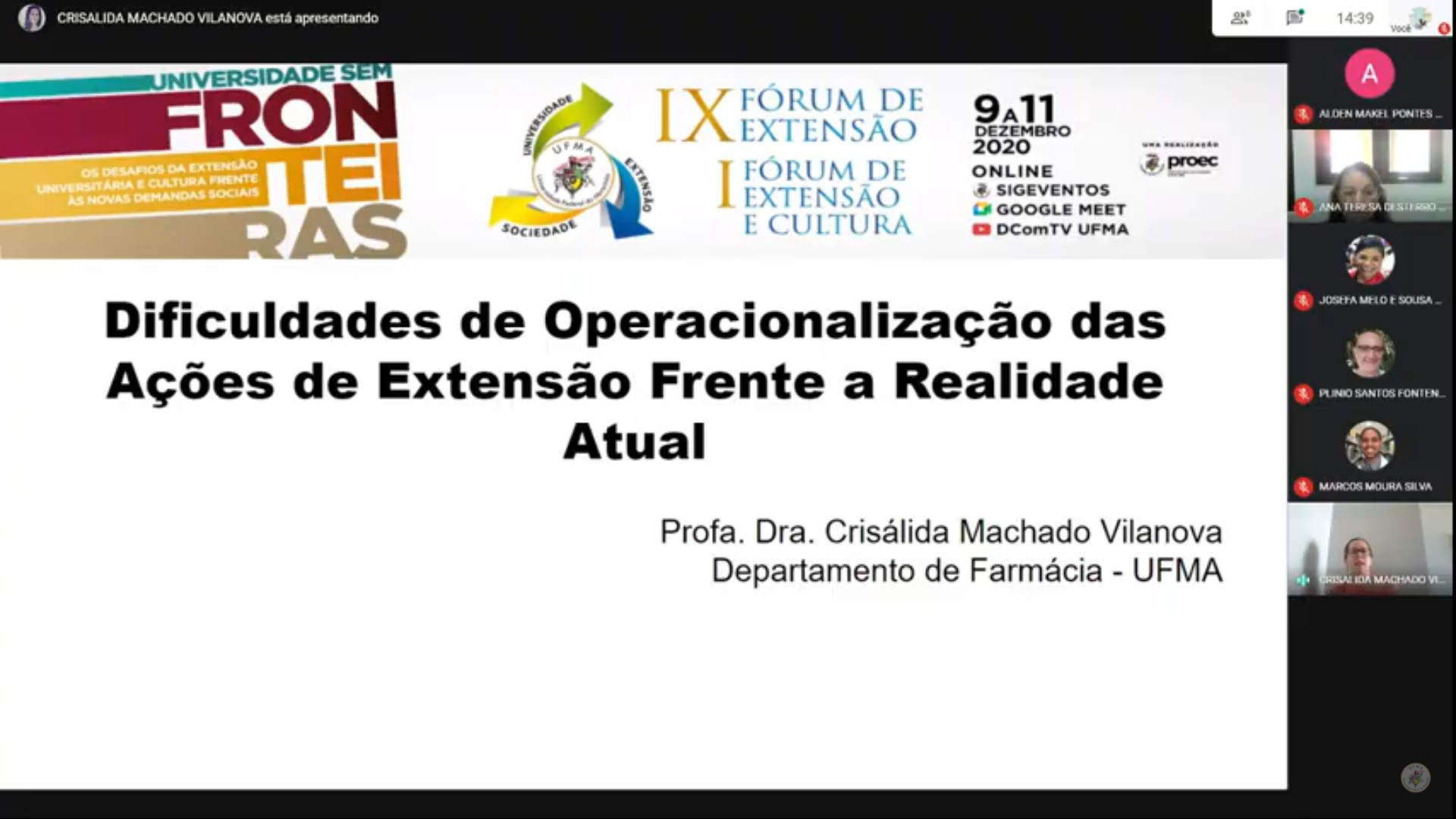 O professor Tácito Borralho iniciou as considerações falando sobre elementos artísticos e seus pesos culturais no Maranhão e sobre os projetos coordenados por ele, em que relatou as dificuldades, paralisações e adaptações em ações por conta da pandemia. Em seu momento, a professora Ana Teresa Desterro, conhecida como professora Estrelinha, começou declamando um acróstico com a própria palavra “Extensão”, em que também mencionou aspectos sobre os benefícios da extensão universitária para a sociedade e para os estudantes.