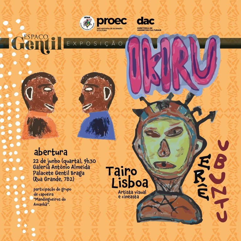 A exposição será aberta nessa quarta-feira, 22, a partir das 9h30, e contará com a participação do grupo de capoeira “Mandingueiros do Amanhã”, comandado por Mestre Bamba. A iniciativa é da Diretoria de Assuntos Culturais (DAC) da Pró-Reitoria de Extensão e Cultura (Proec) da Universidade Federal do Maranhão. A exposição de Tairo Lisboa é composta de desenhos, pinturas em papel, lambe-lambe, estêncil, brinquedos artesanais, fotografias de ações artísticas em comunidades rurais e urbanas e obras interativas influenciadas pelas artes ancestrais do período rupestre.