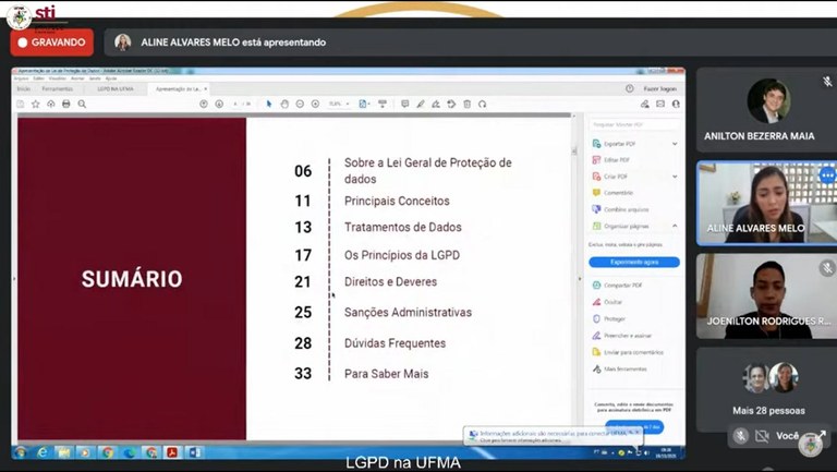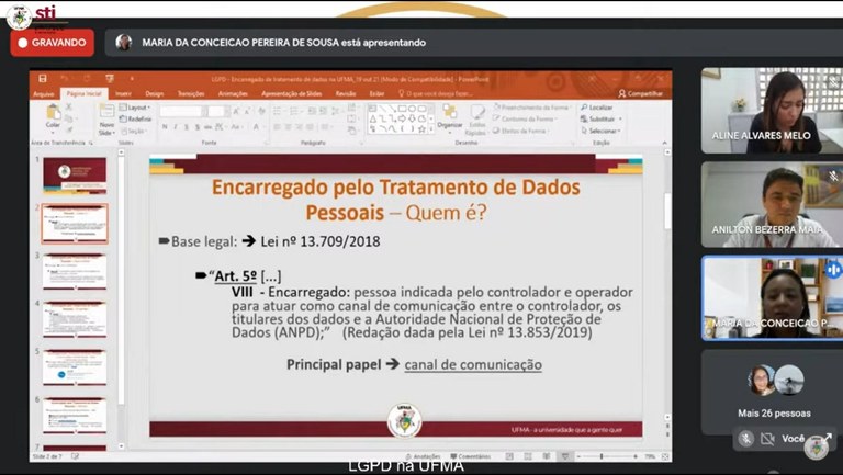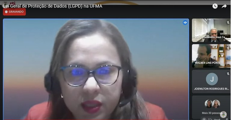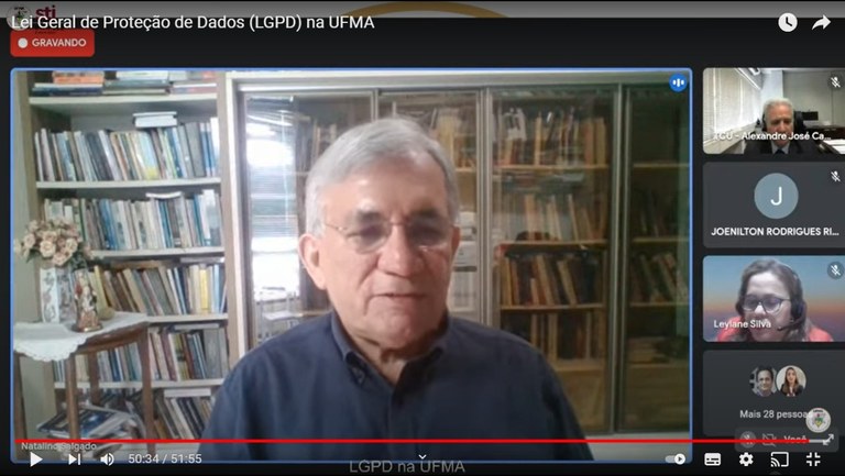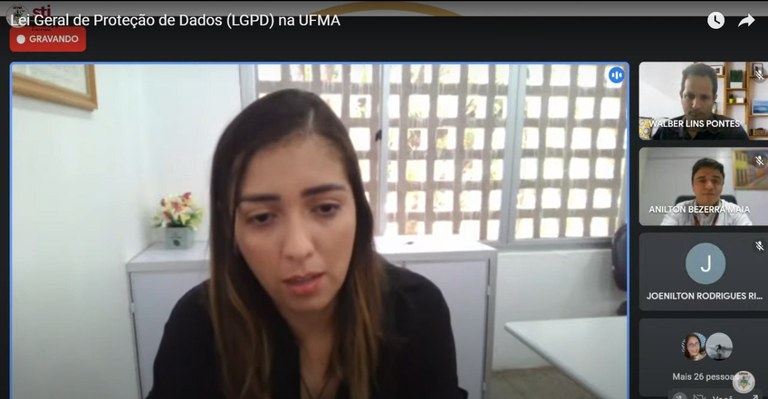 Na mesa virtual, estiveram presentes o reitor Natalino Salgado Filho; a superintendente regional da Controladoria Geral da União, Leylane Maria da Silva; o secretário do Tribunal de Contas da União do Estado do Maranhão (TCU-MA), Alexandre José Caminha Walraven; o pró-reitor de Planejamento, Gestão e Transparência, Walber Lins Pontes; o superintendente de Tecnologia da Informação, Anílton Bezerra Maia; a diretora de Gestão, Modernização e Transparência (DGMT), Aline Alvares Melo; e a chefe da Ouvidoria e encarregada de Dados da UFMA, Maria da Conceição Pereira de Sousa, que prestou alguns esclarecimentos básicos ao realizar uma apresentação sobre quem é o cargo de tratamento de dados.
