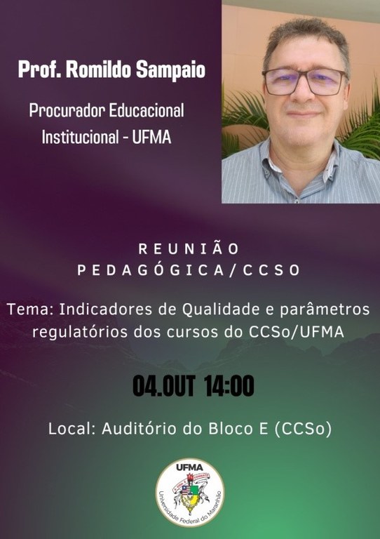 A Diretoria do Centro de Ciências Sociais (CCSO) realizará uma reunião pedagógica nessa terça-feira, 4, com início às 14h, com o procurador educacional Institucional da UFMA, Romildo Sampaio. A discussão será no tema “Indicadores de Qualidade e Parâmetros Regulatórios dos cursos do CCSO-UFMA”, no miniauditório do CCSO, localizado no segundo piso do Bloco E.
