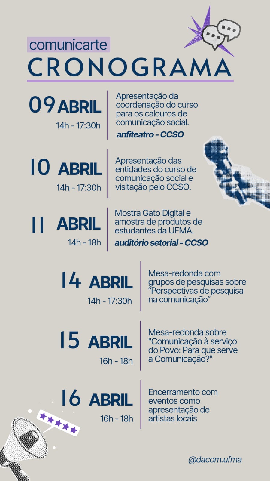 Com o intuito de integrar os estudantes da Universidade e promover um espaço de reflexão política, acadêmica e cultural, por meio de debates, oficinas, exposições e diversas outras atividades, o Diretório Acadêmico de Comunicação Social (Dacom) da Universidade Federal do Maranhão (UFMA), em parceria com a Atlética Cerberus e a coordenação do curso de Comunicação Social, promove o 15° Comunicarte, que ocorre depois de um hiato de dezoito anos. A última edição foi realizada em 2007.