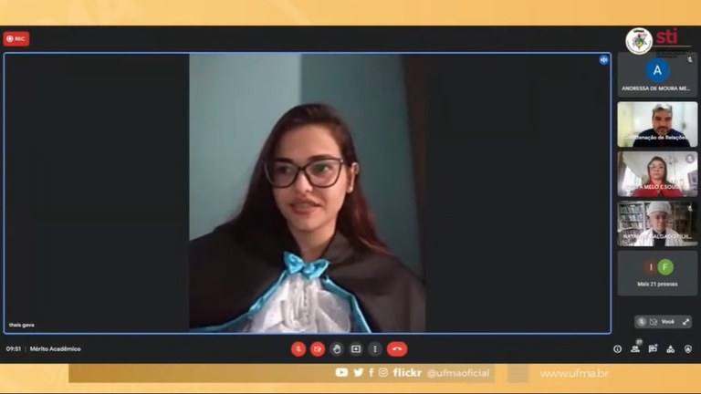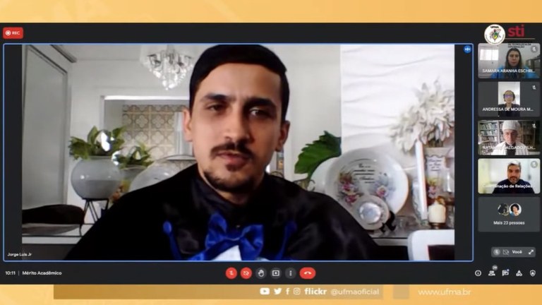Foi realizada nesta terça, 1º de fevereiro, a Cerimônia de Concessão de Mérito Acadêmico, regularizada pela Resolução Consepe Nº 1.983, aos alunos Jorge Luís Júnior e Lorena Batista Silva, ambos do curso Hotelaria; e Thaís Teixeira Gava, do curso Oceanografia. A homenagem é uma honraria pela excelência e relevância intelectual ao longo da graduação, ocasião que marca a primeira vez que graduandos dos respectivos cursos recebem o diploma. A cerimônia foi transmitida ao vivo e está disponível no Canal Institucional da UFMA no Youtube.