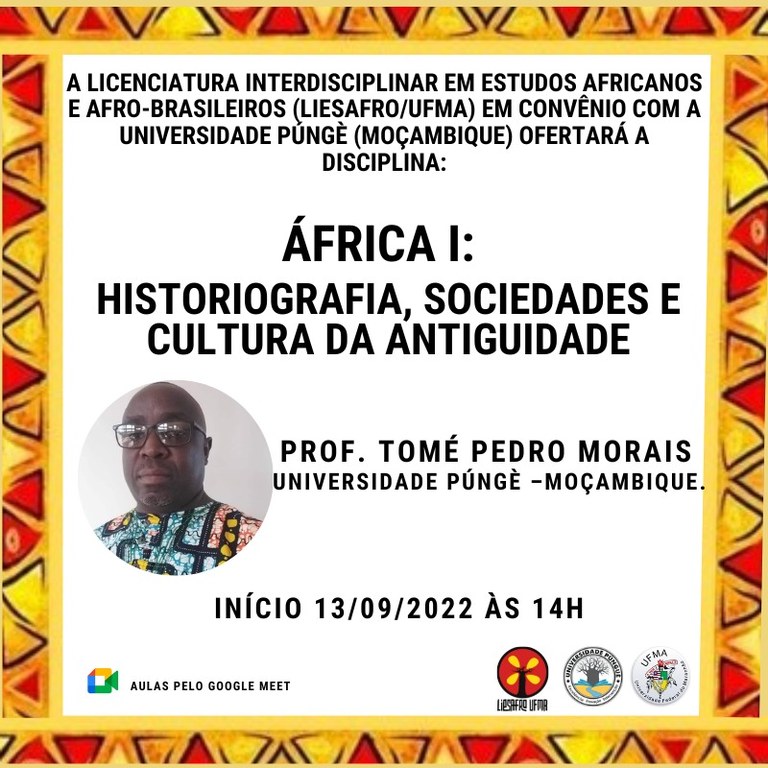 A Licenciatura Interdisciplinar em Estudos Africanos e Afro-Brasileiros (Liesafro), em convênio com a Universidade Púngè – Chimoio, de Moçambique, dará início à disciplina “África I: Historiografia, Sociedades e Cultura da Antiguidade” em formato remoto, a partir de hoje, com início às 14h. A disciplina será ministrada pelo professor moçambicano Tomé Pedro Morais, diretamente da Universidade Púngè – Chimoio.