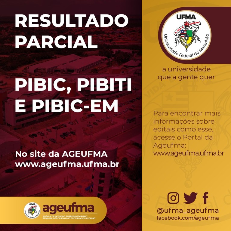 Estão disponíveis na página da Ageufma os resultados parciais dos editais Nº 26, Nº 32 e Nº 33, que se referem aos programas institucionais de Bolsas de Iniciação Científica e Iniciação ao Desenvolvimento Tecnológico e Inovação (PIBIC, PIBITI e PIBIC-EM).