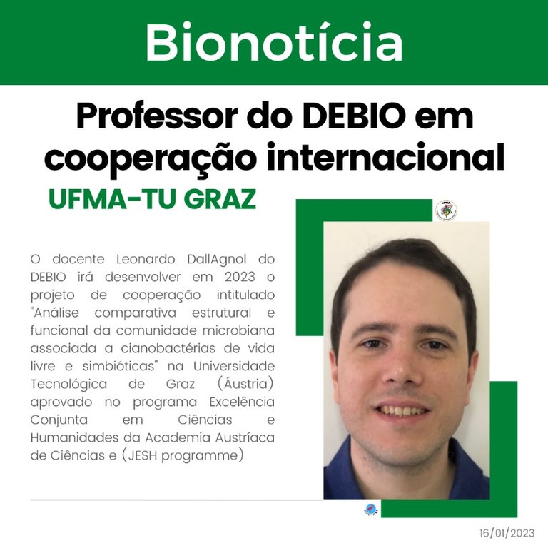 O docente Leonardo Dall’Agnol, do Departamento de Biologia da Universidade Federal do Maranhão, participará do Programa de Cooperação de Excelência em Ciência e Humanidades (Joint Excellence in Science and Humanities - Jesh), realizado na Universidade Tecnológica de Graz (TU-Graz), na Áustria. Durante três meses, ele desenvolverá o projeto “Análise comparativa estrutural e funcional da comunidade microbiana associada a cianobactérias de vida livre e simbióticas” que terá início em fevereiro deste ano.