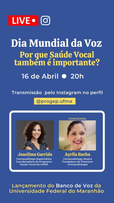 Com o objetivo de debater a importância de inserir os cuidados com a saúde vocal na rotina em qualquer tempo, a Divisão de Qualidade de Vida (DQV), vinculada à Coordenação de Atenção à Saúde do Trabalhador (Cass) e à Pró-Reitoria de Gestão de Pessoas (Progep), por meio do programa “Saúde Vocal”, promoverá, nessa sexta, 16, a partir das 20h, por meio do Instagram @progep.ufma, a live “Porque Saúde Vocal também é importante?”, com a participação de Joseilma de Azevedo Garrido, fonoaudióloga e coordenadora do programa Saúde Vocal da DQV, e de Ayrlla Texeira Rocha, fonoaudióloga, perita e fundadora da Premium Fonoaudiologia.