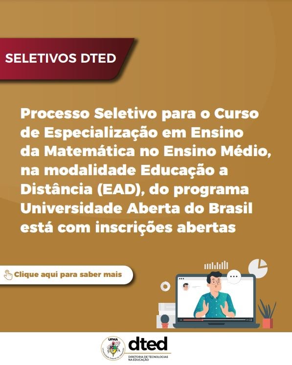 A Agência de Inovação, Empreendedorismo, Pesquisa, Pós-graduação e Internacionalização (AGEUFMA), por meio da Diretoria de Tecnologias na Educação (DTED) da Universidade Federal do Maranhão, abre o Processo Seletivo para o Curso de Especialização em Ensino da Matemática no Ensino Médio, na modalidade Educação a Distância (EaD), regido pelo Edital Nº. 074.2021, com inscrições até as 22h do dia 4 de outubro de 2021, observado o horário local.