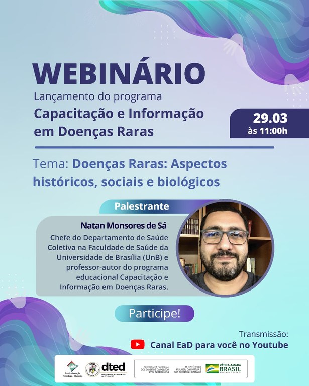 O webinário será ministrado pelo chefe do Departamento de Saúde Coletiva na Faculdade de Saúde da Universidade de Brasília (UnB) e professor-autor do programa educacional Capacitação e Informação em Doenças Raras, Natan Monsores de Sá.