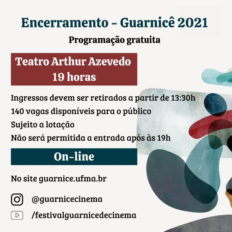 Realizado pela Pró-Reitoria de Extensão e Cultura (Proec) da Universidade Federal do Maranhão, o Guarnicê 2021, que foi iniciado no último dia 17, será finalizado hoje, 24 de setembro, com os patrocínios do Instituto Cultural Vale; do Governo do Maranhão; da Secretaria de Cultura do Maranhão (Secma), por meio da Lei Estadual de Incentivo à Cultura; e do Centro Elétrico e da Equatorial Maranhão.