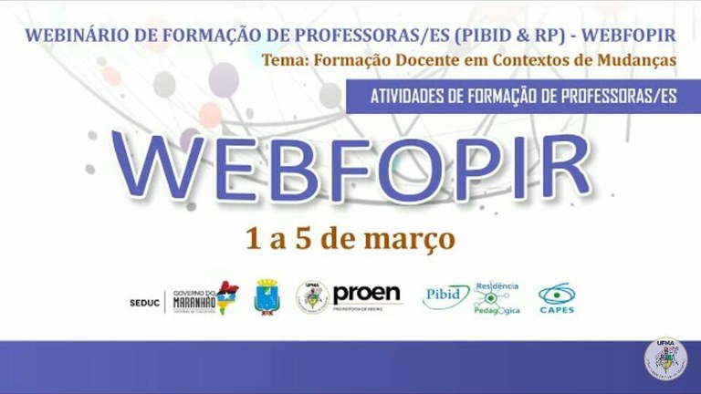 Na segunda-feira, 1º, foi dado início ao I Webinário de Formação de Professores (Webfopir). A abertura contou com o webinário “Formação de Docentes em contextos de mudança” transmitida ao vivo pelo Canal Institucional da UFMA no YouTube. O evento é promovido pelos programas institucionais de Bolsas de Iniciação à Docência (Pibid) e Residência Pedagógica, com o apoio da Pró-Reitoria de Ensino (Proen) e em parceria com a Secretaria de Estado da Educação do Maranhão (Seduc).