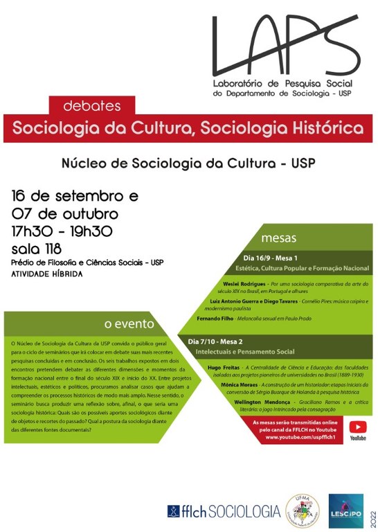 Em parceria com o Laboratório de Estudos Ciência, Cultura e Poder (Lescipo) do curso de Licenciatura em Ciências Humanas – Sociologia do Centro de Ciências de São Bernardo, nessa sexta-feira, 16, e no dia 7 de outubro deste ano, ocorrerá o evento “Sociologia da Cultura, Sociologia Histórica”, presencialmente na Universidade de São Paulo (USP) e com transmissão on-line, via canal da FFLCH no Youtube. A iniciativa é uma realização do Núcleo de Sociologia da Cultura da USP.