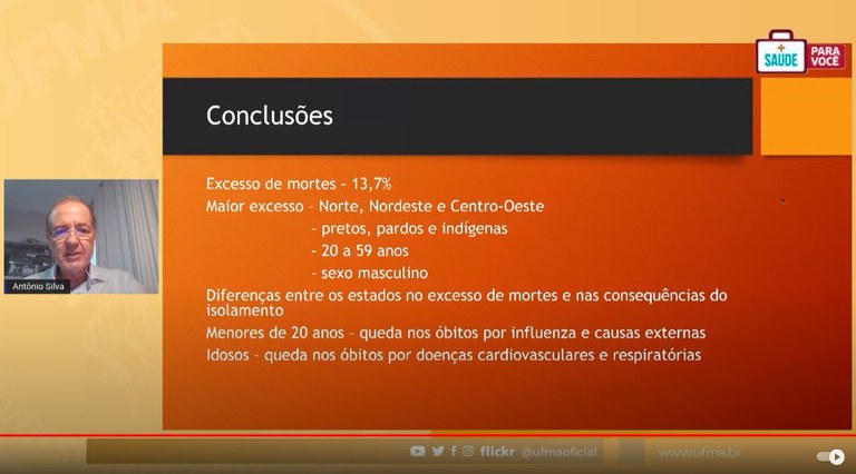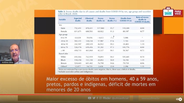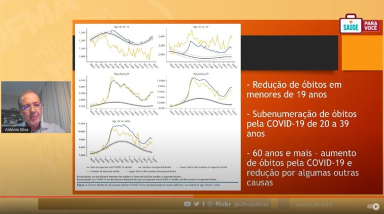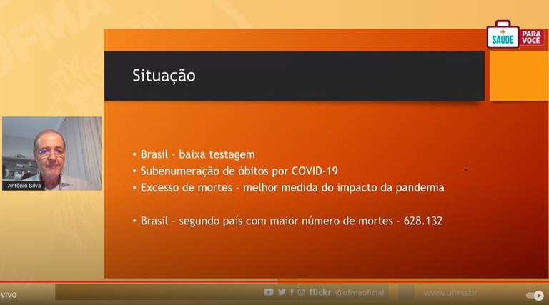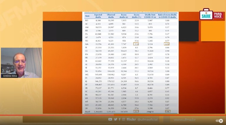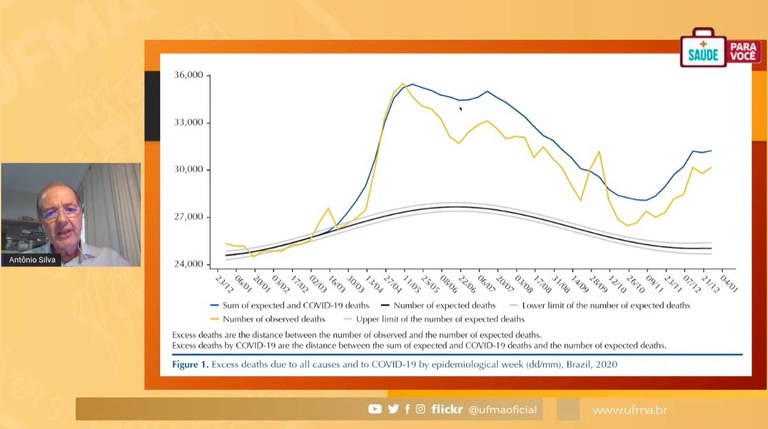 Na tarde desta quinta-feira, 3, o médico, epidemiologista e professor da UFMA Antônio Augusto Moura Silva ministrou o webinário “Covid-19: Excesso de mortalidade no Brasil em 2020”, em que mostrou dados de um estudo feito pelo Grupo de Modelagem da Covid-19 na UFMA – no qual é coordenador – sobre o excesso de mortes e a subnumeração de óbitos por covid-19 no ano de 2020, em que várias mortes não foram atribuídas à doença nem aparecem nos dados oficiais da enfermidade. Segundo o docente, o método que se tornou a melhor medida de análise do impacto da pandemia, no contexto em que o Brasil é o segundo país com maior número de mortes no mundo e tem consideráveis taxas de subnotificação.