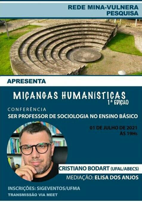 Com o tema “Ser Professor de Sociologia no Ensino Básico”, o evento Miçangas Humanísticas abre suas inscrições até o dia 30 de junho. Os interessados podem se inscrever gratuitamente por um formulário on-line ou pelo SIGEventos. O evento ocorrerá no dia 1° de julho, por meio do Google Meet e tem como público-alvo estudantes e professores da Universidade Federal do Maranhão e a comunidade em geral. O evento terá a conferência do professor Cristiano Bodart, do Centro de Educação (Cedu) da Universidade Federal de Alagoas (Ufal), que visa suscitar reflexões sobre a formação, os desafios e o cotidiano da atuação dos professores de sociologia nas redes de ensino do Brasil.