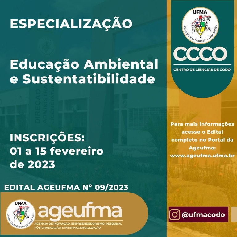 A Pró-Reitoria da Agência de Inovação, Empreendedorismo, Pesquisa, Pós-Graduação e Internacionalização (Ageufma) da Universidade Federal do Maranhão tornou público o edital do processo seletivo para o curso de pós-graduação lato sensu em Educação Ambiental e Sustentabilidade, que ocorrerá no Centro de Ciências de Codó (CCCo). As inscrições irão até o dia 15 deste mês e podem ser realizadas via Sistema Integrado de Gestão de Atividades Acadêmicas (Sigaa).