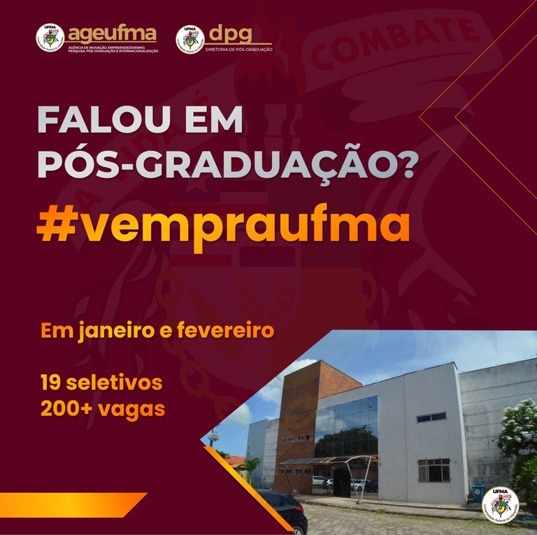 A Universidade Federal do Maranhão possui 53 Programas de Pós-Graduação com 64 cursos entre mestrados e doutorados. Neste início de ano, 15 cursos de mestrado e 4 de doutorado da UFMA abriram seleção para ingresso nas turmas de 2023, contabilizando mais de 200 vagas na pós-graduação. Todos os editais de seleção estão disponibilizados no site da Ageufma.