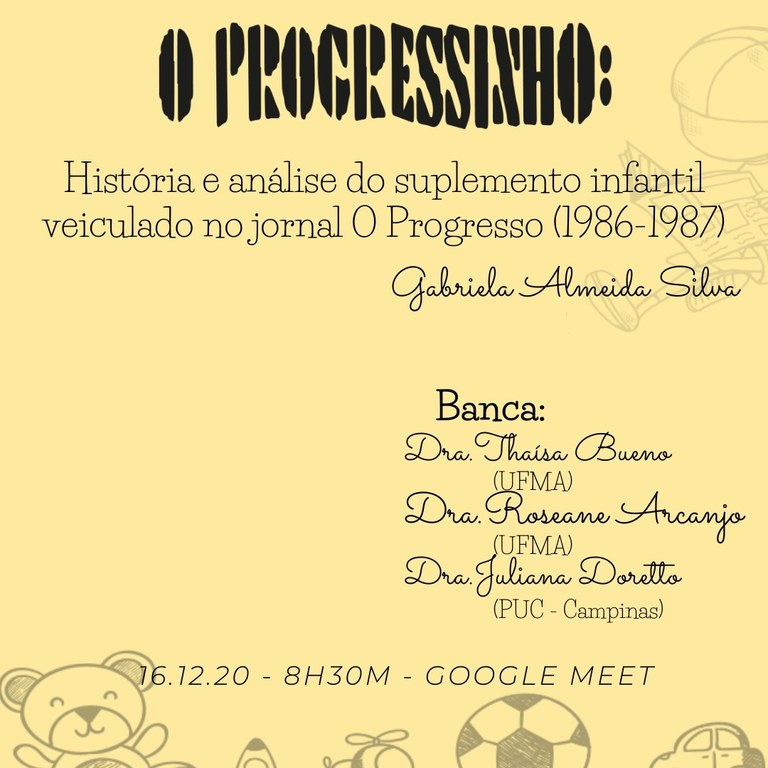 Intitulada “O Progressinho: história e análise do suplemento infantil veiculado no jornal O Progresso (1986-1987)”, a pesquisa é resultado do trabalho de conclusão de curso da estudante e fundamenta-se dentro de um contexto local como investigação de um documento que compõe parte da história da cidade, sendo veiculado em Imperatriz no período de 1986 a 1987 pelo jornal regional O Progresso.