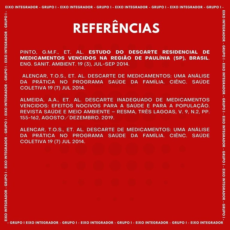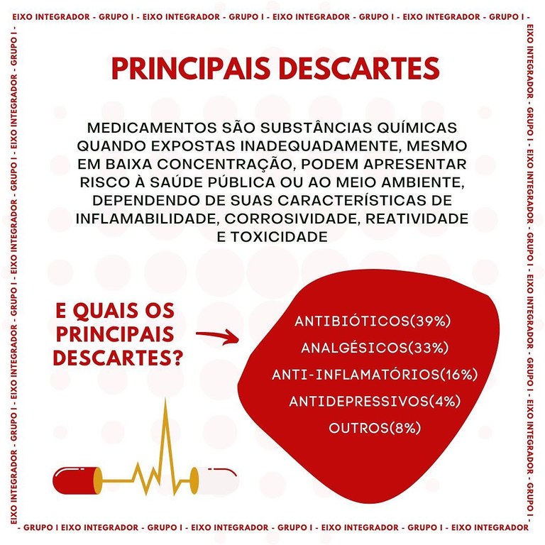 Quatorze estudantes do segundo período do curso de Medicina do Câmpus São Luís criaram um material sobre riscos e consequências do descarte inadequado de medicamentos, e fizeram a divulgação por meio de postagens, em redes sociais. Sob a orientação da professora Walquiria Lemos Ribeiro da Silva Soares, as postagens têm informações sobre os principais descartes, as consequências para a saúde pública e os riscos ambientais.