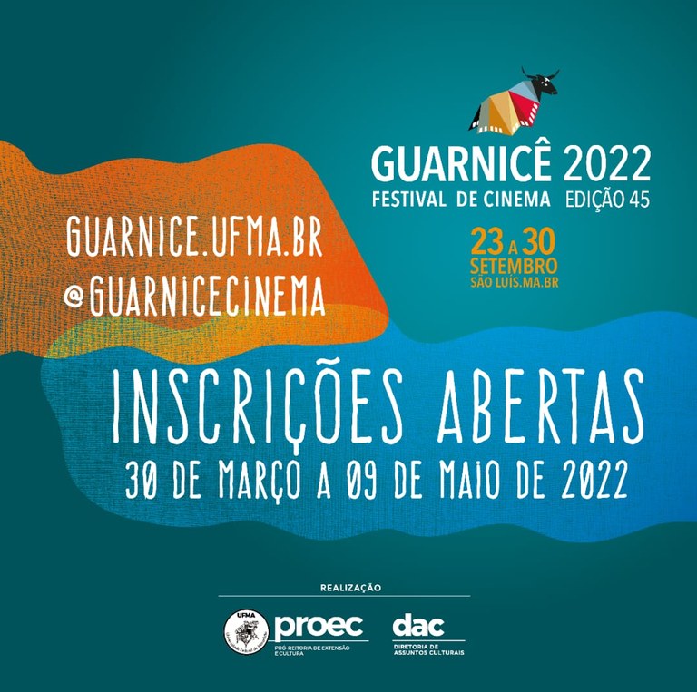 Estão abertas as inscrições para o Festival Guarnicê de Cinema 2022 – Edição 45. O evento será realizado em formato híbrido (com programação em São Luís e virtual) entre os dias 23 e 30 de setembro. As inscrições podem ser feitas até 9 de maio, por meio dos formulários disponíveis no site guarnice.ufma.br.