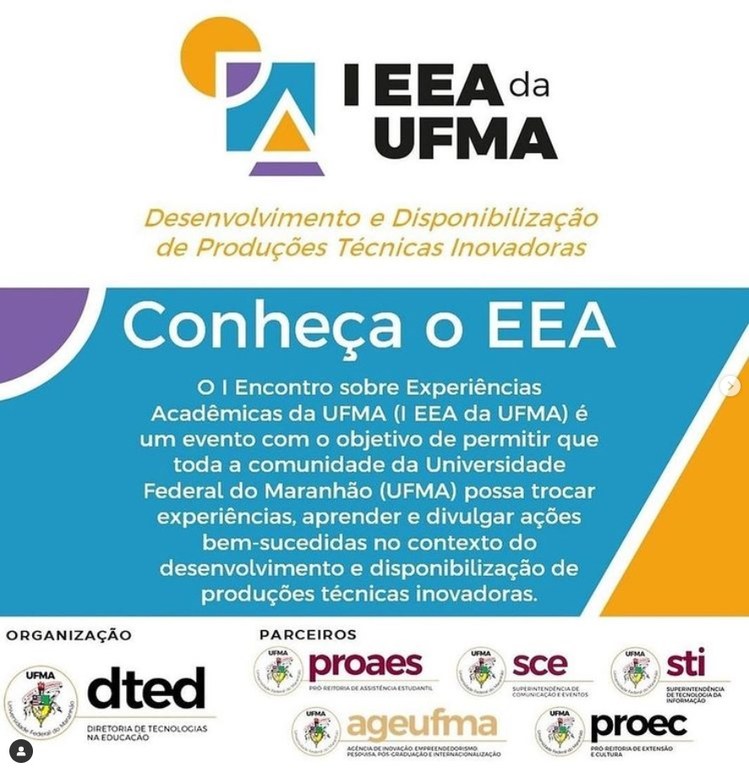 O primeiro EEA é organizado pela Diretoria de Tecnologia na Educação (DTED), em parceria com a Superintendência de Tecnologia da Informação (STI); Agência de Inovação, Empreendedorismo, Pesquisa, Pós-Graduação e Internacionalização (Ageufma); Pró-Reitoria de Assistência Estudantil (Proaes); e a Pró-Reitoria de Extensão e Cultura (Proec).