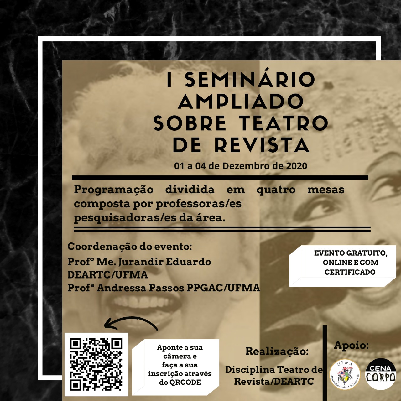 SÃO LUÍS – Começou hoje, dia 1º, o I Seminário Ampliado Sobre Teatro de Revista, promovido pelo curso de Licenciatura em Teatro da UFMA, por meio da disciplina de Teatro de Revista. O evento tem por objetivo propor à comunidade acadêmica um espaço de contato, reflexão e difusão do pensamento crítico sobre o gênero teatral.