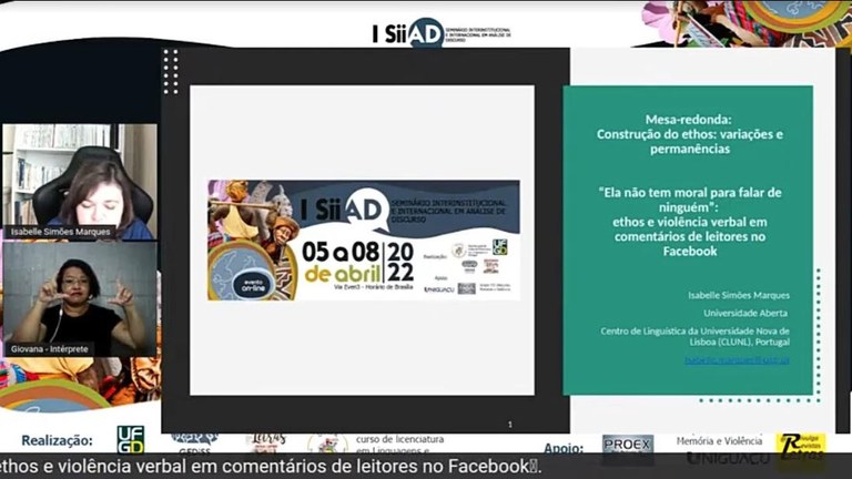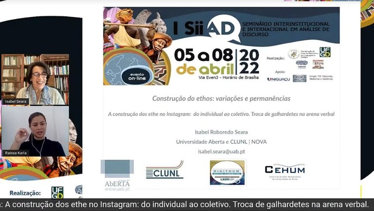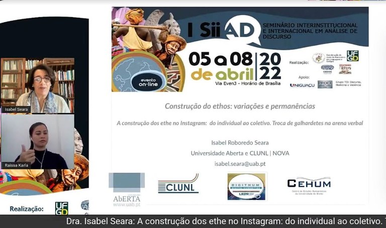 Em seguida, a docente Isabel Seara realizou uma apresentação sobre a temática “A construção do ethos no Instagram: do individual ao coletivo; troca de galhardetes na arena verbal”, em que falou sobre a relevância e os padrões argumentativos da construção do ethos na rede social Instagram. “A escolha de um determinado padrão tem impacto na projeção do ethos, a forma como o locutor argumenta, permite interferências sobre seu caráter e encoraja o destinatário a atribuir uma determinada qualidade”, comentou.