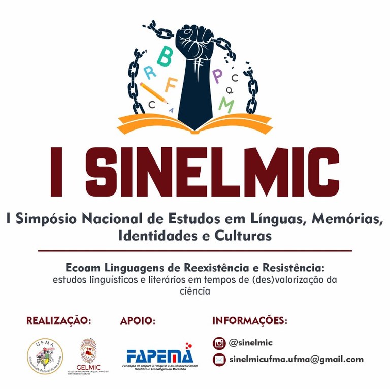 Estão abertas as inscrições para o I Simpósio de Estudos em Línguas, Memórias, Identidade e Culturas (Sinelmic), que será realizado entre os dias 24 e 25 de maio, em formato digital. Organizado pelo Curso de Licenciatura em Letras da Universidade Federal do Maranhão, o evento traz o eixo temático "Ecoam linguagens de reexistência e resistência: estudos linguísticos e literários em tempos de (des)valorização da ciência", com o objetivo de promover visibilidade às pesquisas que abordam a linguagem sob uma óptica de resistência social.