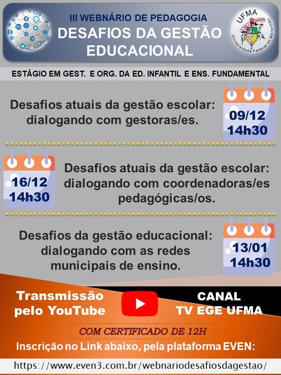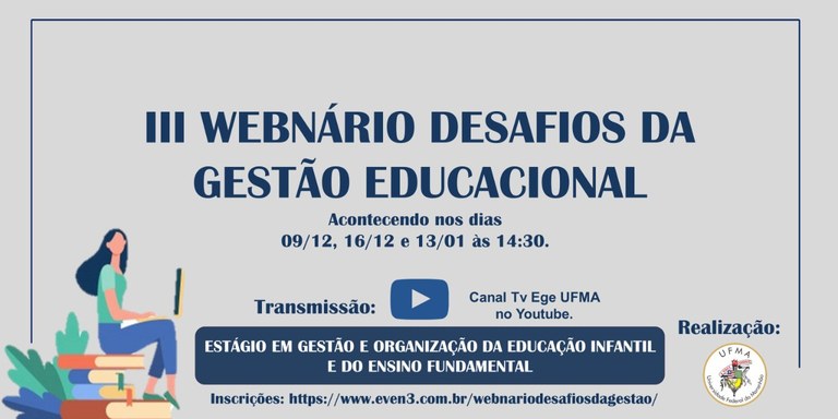 Com o objetivo de discutir os desafios atuais da gestão educacional, será aberto hoje, 9, às 14h30, o III Webinário de Gestão Educacional. O evento terá programação também nos dias 16 de dezembro deste ano e em 13 de janeiro de 2022, sempre com transmissão pelo canal no Youtube TV EGE UFMA e tendo como convidados gestores, coordenadores pedagógicos e secretários da Secretaria Municipal de Educação (Semed) que compartilharão suas vivências e ponderações voltadas à gestão educacional.